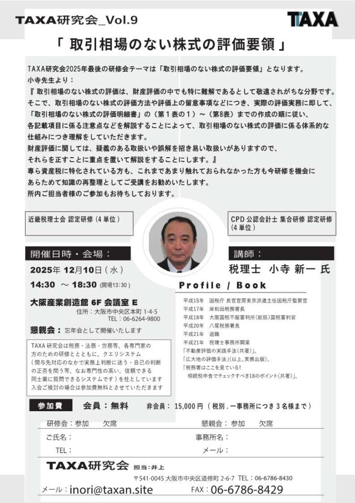TAXA研究会2025年最後の研修会テーマは「取引相場のない株式の評価要領」となります。